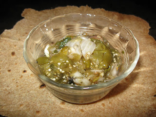 Thaw 1 1/2 quarts frozen tomatillos in a saucepan over low heat, draining water a couple times. Once thawed, break them up with a potato masher and add the following.